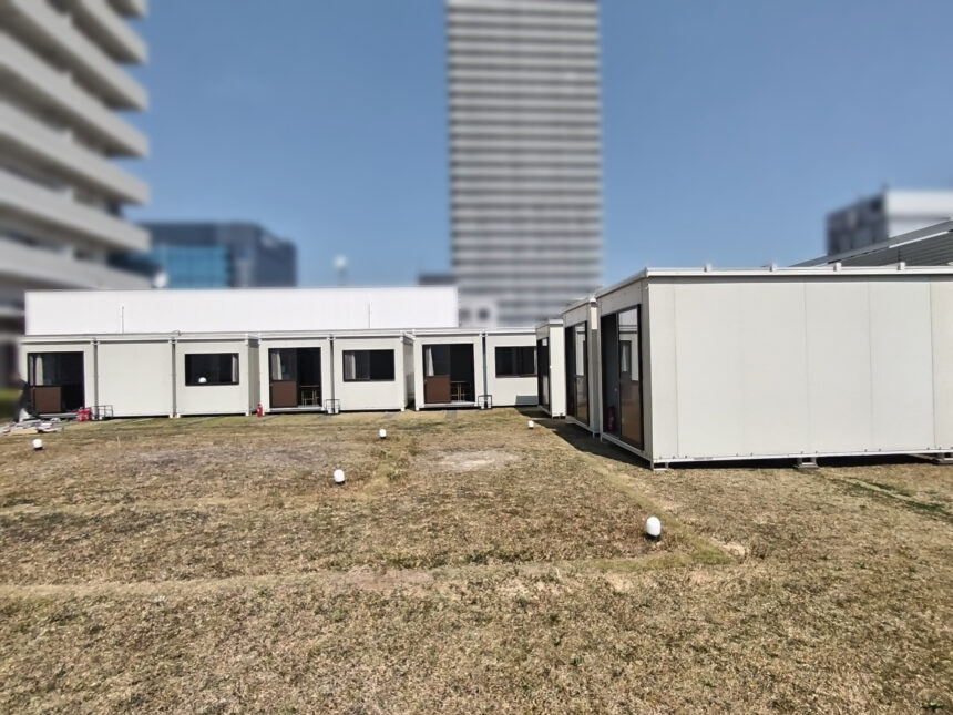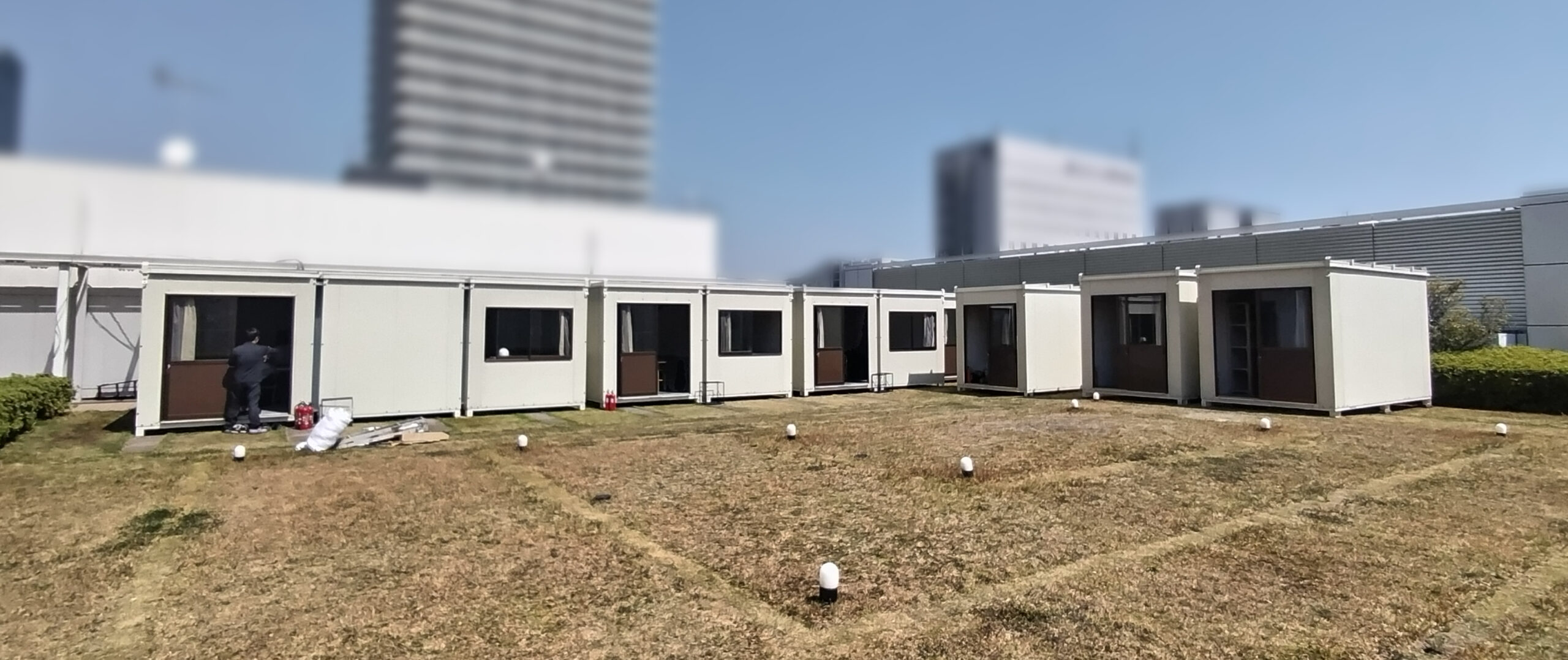 岐阜県岐阜市のお客様へ、3坪組立パネルハウス10棟を、タワー5階屋上の芝生エリアに搬入・設置いたしました。